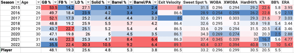 Before Kyle Hendricks takes the mound for the second game of the Crosstown Series with White Sox on May 4th, I wanted to dig into his early season results. Through five starts this season, Kyle Hendricks hasn’t pitched like a frontline starter at the top of the Cubs’ rotation. It’s been a few seasons since we’ve seen him be truly elite (not-so-humble brag: I was at Wrigley when Kyle outdueled Kershaw in Game 6 of the 2016 NLCS to clinch the pennant. *chef’s kiss*). But it’s fair to say Kyle is a much better pitcher than what we’ve seen early in 2022.