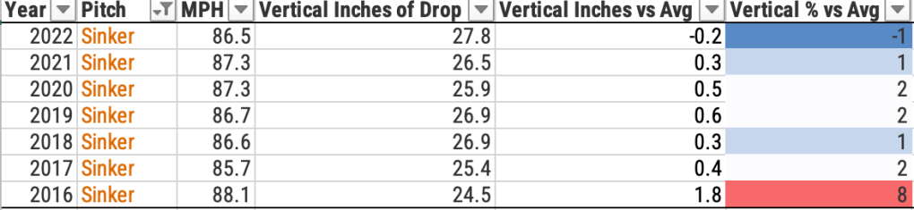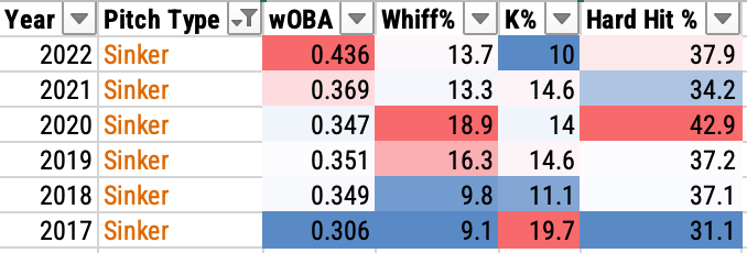 Kyle’s 33.5% frequency on the sinker is not just down from 2021, it’s the lowest frequency he’s ever thrown the pitch. He’s thrown sinkers as more than 40% of his offerings in six of the last nine seasons. He’s well below that mark so far in 2022 which is a likely contributor to the career-low ground ball rate of 35.5% through five starts (sinking fastballs drop as they approach home plate causing hitters to make contact with the top half of the ball which results in a ground ball. If he’s throwing fewer sinkers, it makes sense that his ground ball rate is also reduced). Hendricks is generating a 13.7% whiff rate on his sinker which is in line with 2021 and falls somewhere in the middle of his whiff% range since 2017. The whiff rate itself doesn’t signal any issues, but we can also see: