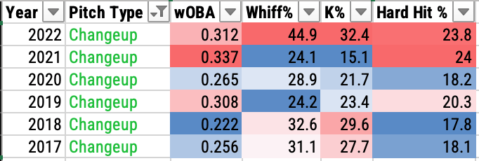 Hendricks’ changeup is his second most-used pitch this season at 29.4%. Per FanGraphs, he’s in the top three frequency of changeups thrown in all of baseball in 2022 behind Pablo Lopez of the Miami Marlins (37.8%) and Logan Webb of the San Francisco Giants (35.9%). The vertical movement he’s getting on the changeup is thirteenth most in baseball. He’s throwing that pitch slightly more than he has in past seasons, but very much in line with previous usage. Of Hendricks’ four pitch types, he gets the lowest hard-hit rate and highest strikeout rate on his changeup. Hitters have a .312 wOBA against the pitch which is just north of the league average wOBA of .305 (against all pitches, not just changeups). Overall, hitters aren’t producing any runs above average against his changeup (run value = 0).