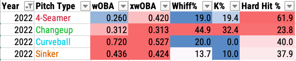 There’s not a lot to evaluate on Kyle’s curveball. He’s only thrown it 10.0% percent of all pitches this season which comes out to 41 total pitches in a limited sample size of five starts. Those 41 pitches came in only five plate appearances. Hitters are 4-for-5 against the pitch with four singles. Those aren’t great outcomes, but there’s no sense in signaling a five-alarm fire by saying the wOBA against this pitch is .720. Room for improvement, sure, but this pitch is at most is a small reason for his early-season struggles.