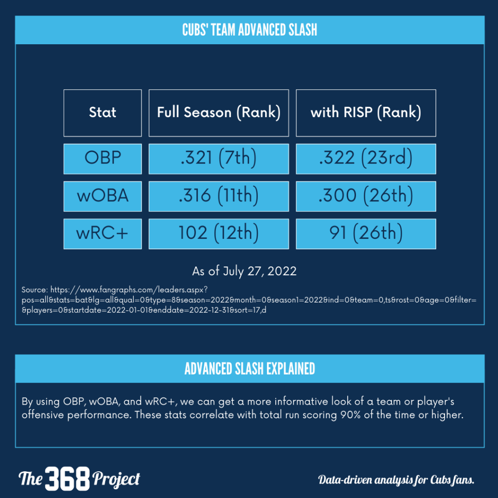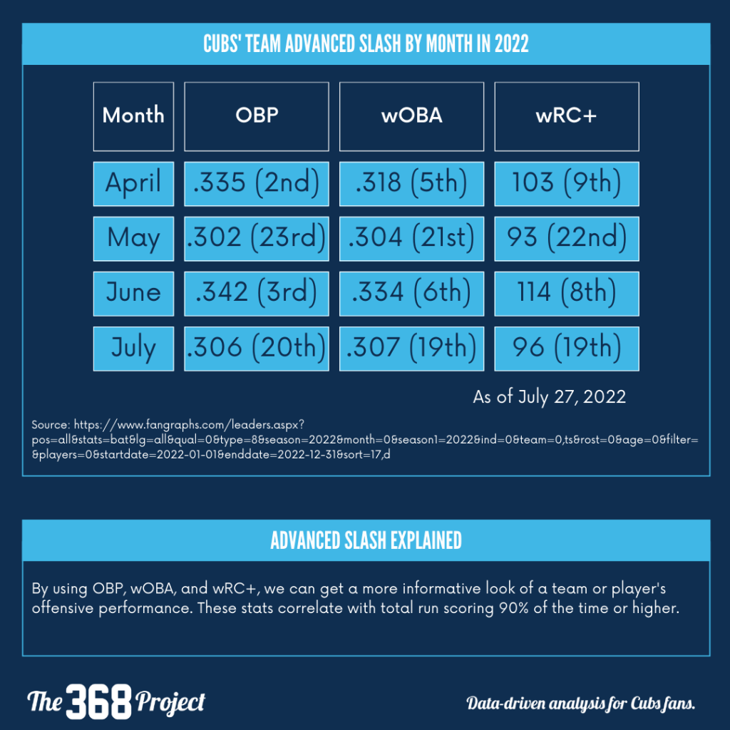 These stats show that the Cubs are hitting a little bit above league average so far in 2022, but struggle to produce to the same level with runners in scoring position. By month, the Cubs were a top-10 offense in April and June, but in the zip code of a bottom-10 offense in May and July.