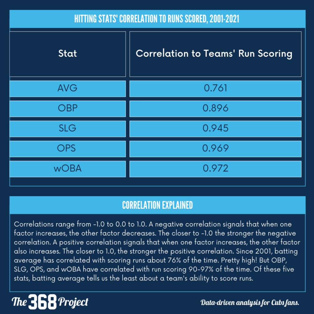 I chose these three stats for specific reasons, but one of the strongest considerations for choosing OBP and wOBA is their correlation to run scoring. After correlating batting average (AVG), on-base percentage (OBP), and weighted on-base average (wOBA) to total team runs for all MLB teams from 2001-2021, here are the results: