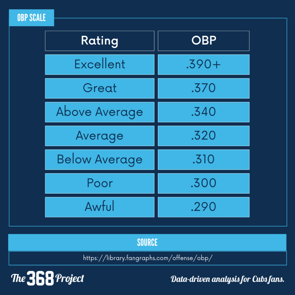 - Cubs hitters reach base 32.1% of the time (league average OBP is .312 or 31.2%)